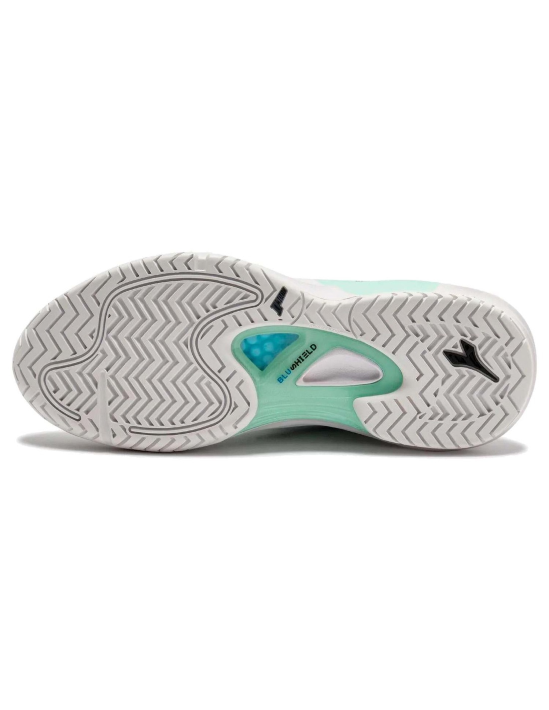 Il vero punto di forza di queste scarpe da tennis Diadora è la calzetta integrata, una struttura avvolgente che aderisce perfettamente al piede come una seconda pelle. Questa costruzione garantisce una calzata precisa, stabile e una sensibilità superiore, permettendo al giocatore di percepire meglio il contatto con il campo e migliorare il controllo nei movimenti più rapidi. Il sistema di allacciatura avvolgente mantiene il piede fermo e sicuro anche nelle accelerazioni improvvise.