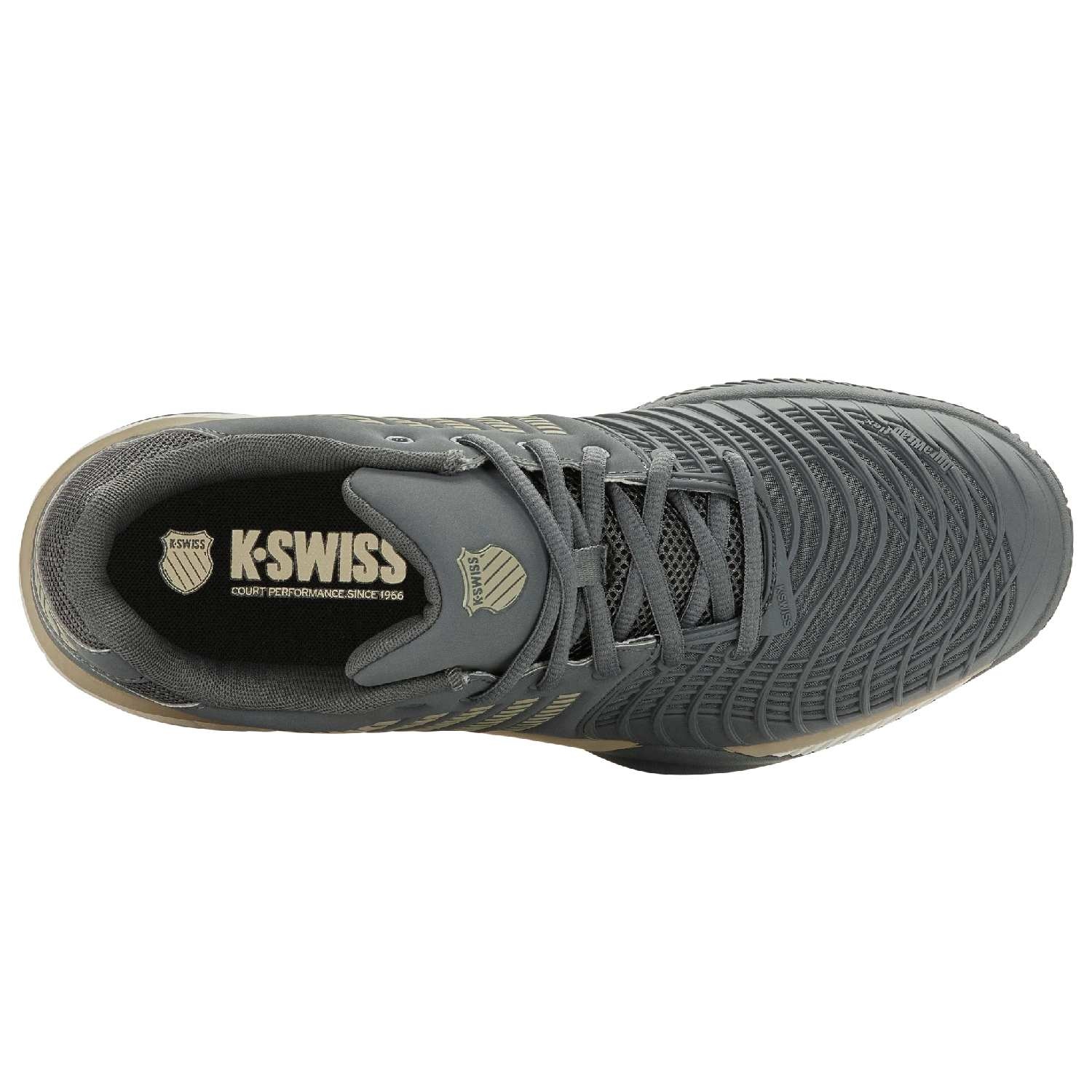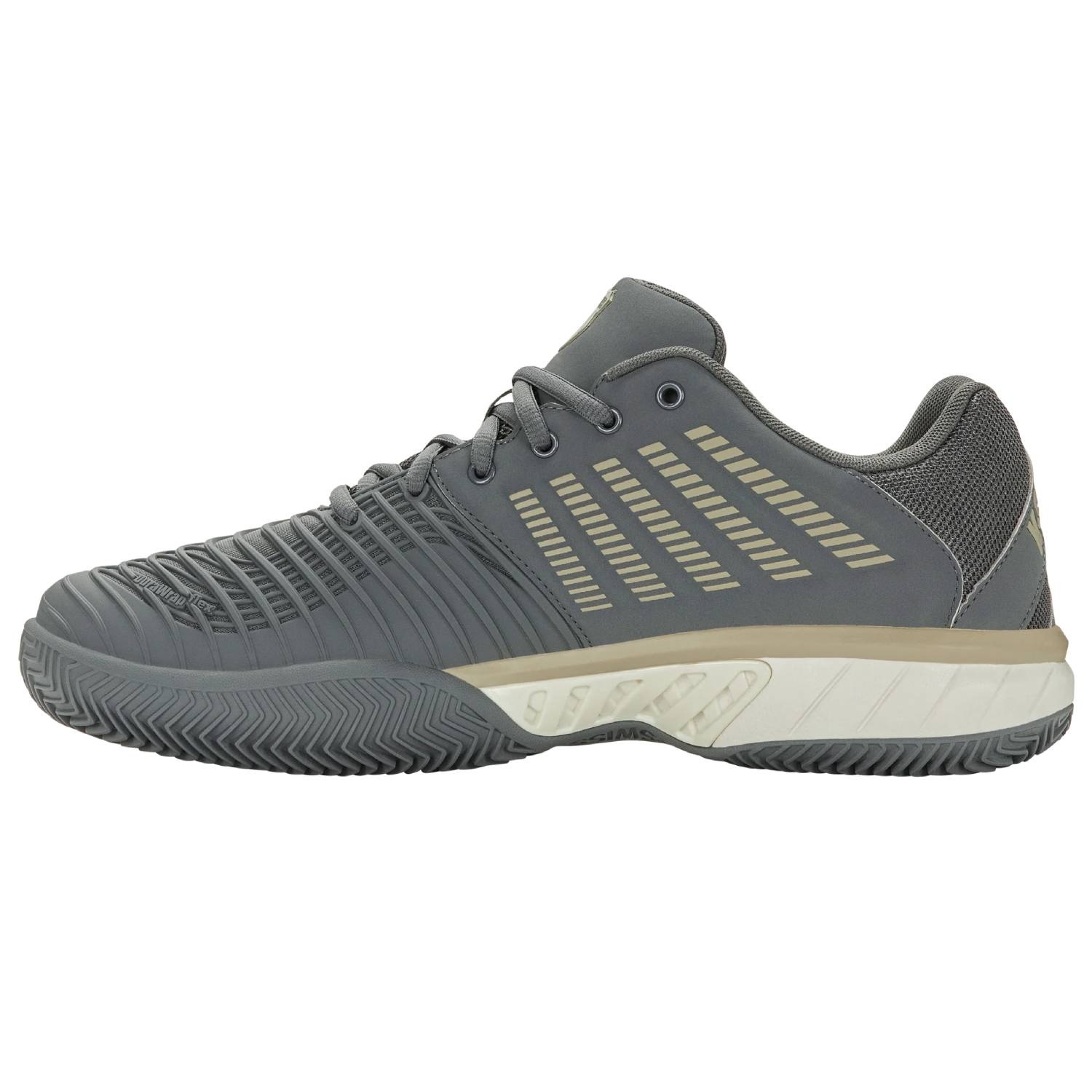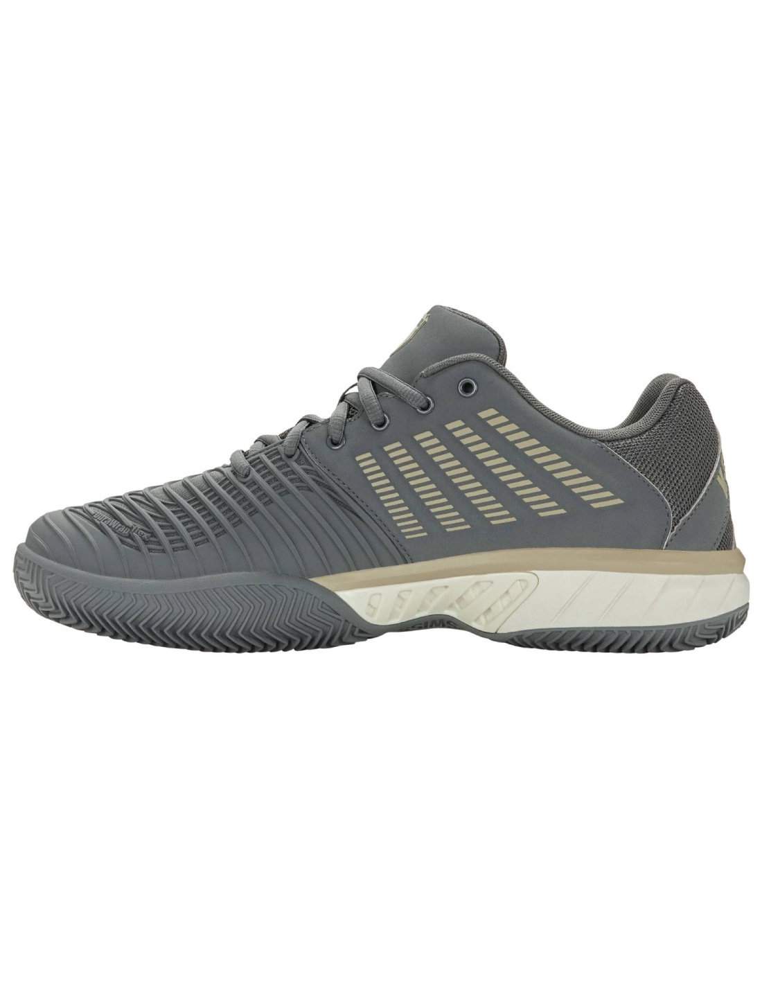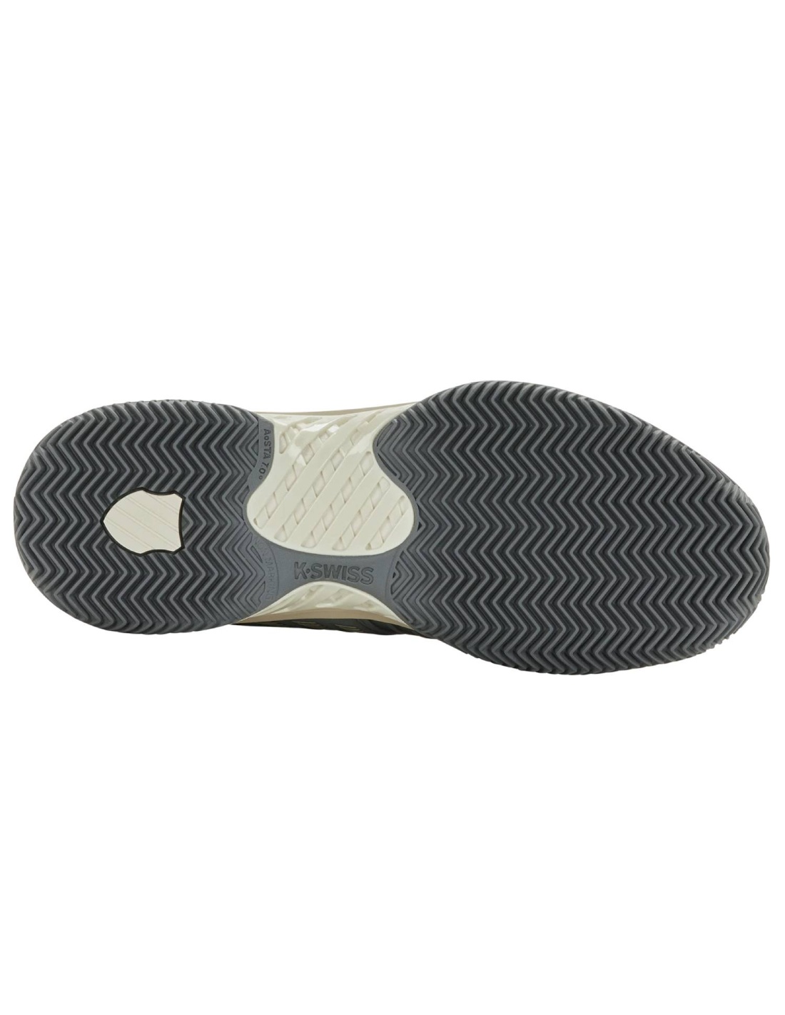 La suola Aosta 7.0 in gomma ad alta densità con motivo a spina di pesce assicura trazione e durata eccellenti su campi in terra battuta , mentre il K-Swiss 180 PSC garantisce stabilità al mesopiede, migliorando sicurezza e reattività nei cambi di direzione.